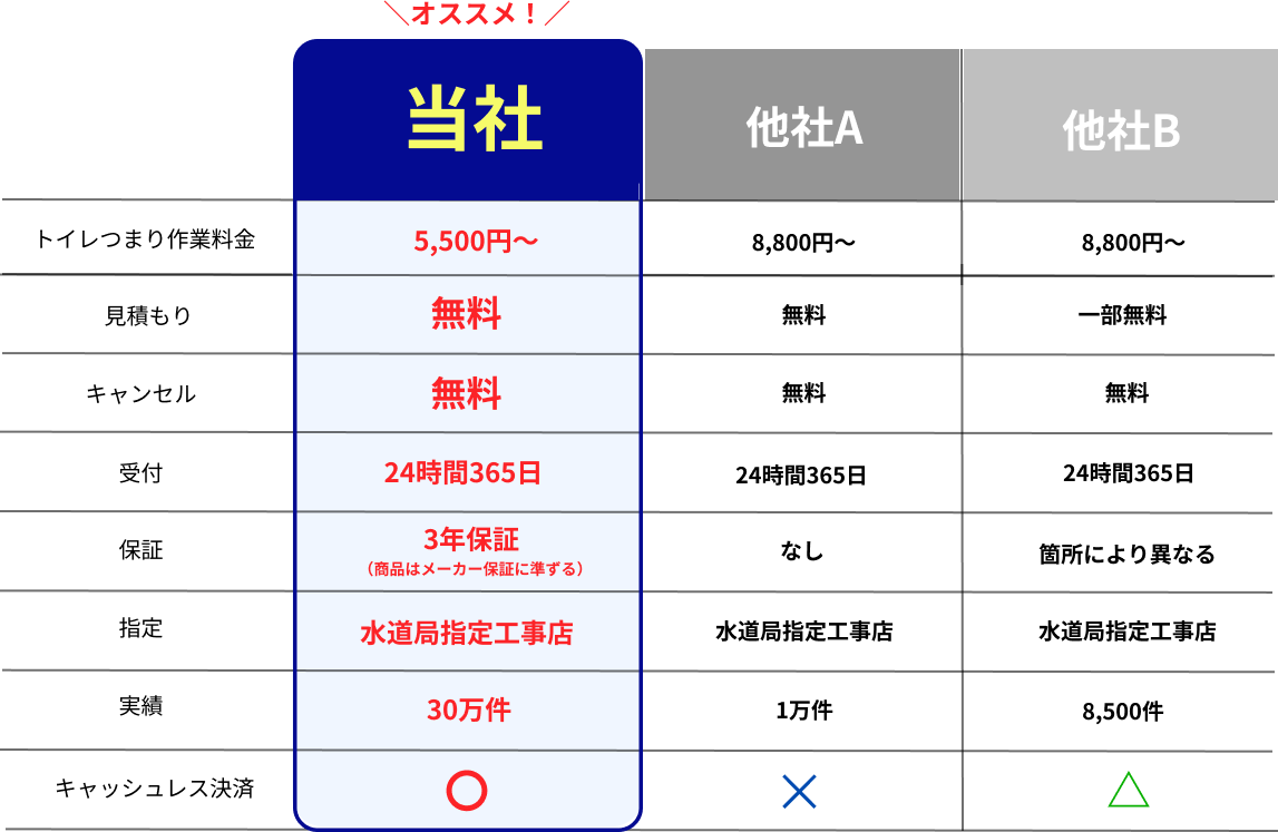 原因として一番多いのは便器内でのつまりですが、排管自体がつまっていたりトイレの劣化によって引き起こされる場合もございます。どこでつまっているか原因をしっかりと見極めて適切に修理いたします。まずお電話にてご相談下さい。