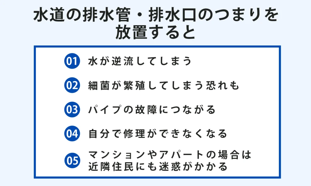 水道の排水管や排水口のつまりを放置すると、非常に大変な事態を招きます。