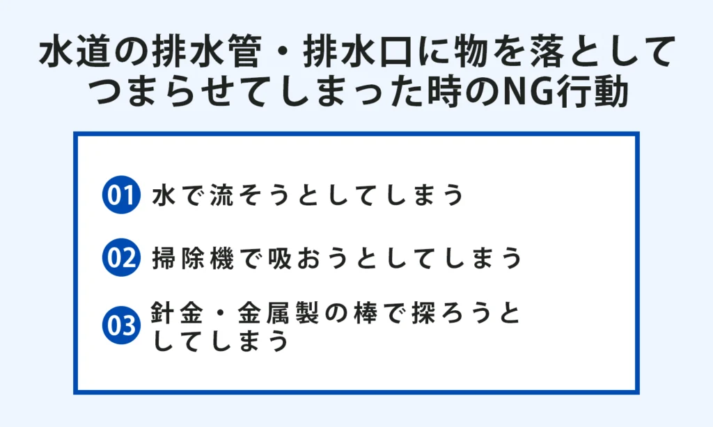 排水管がつまったときの対処法として、NGな行動がいくつかあります。