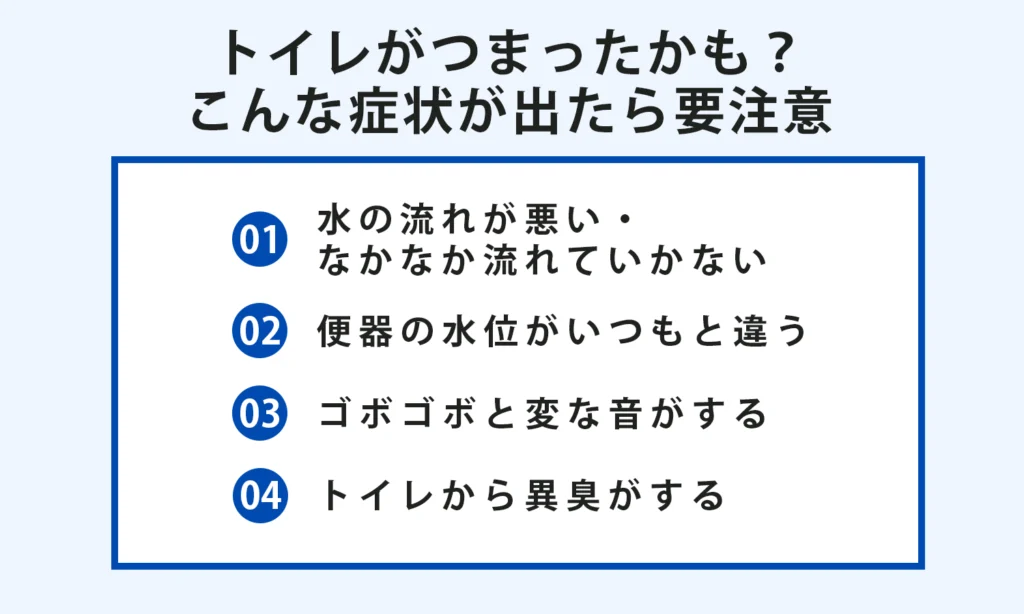 トイレのつまりは、完全に水が流れなくなる前に、いくつかの前兆があることが多いです。早期に気づいて対処すれば、大きなトラブルを防げるでしょう。以下のような症状が現れたら、トイレがつまりかけている可能性があります。