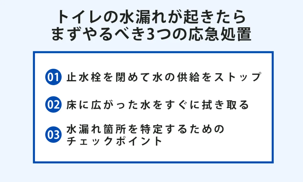 トイレから水が漏れているのを発見したら、まず落ち着いて応急処置を行うことが大切です。水漏れを放置すると、床材の劣化や階下への被害など二次的なトラブルにつながりかねません。水漏れ発生後、すぐに実行すべき3つの応急処置を順番に説明します。