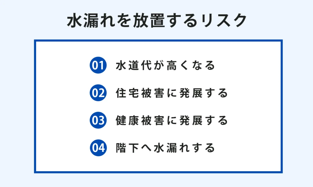 水漏れを放置すると水道代が高くなり、健康・住宅被害に影響が及ぶ可能性があります。